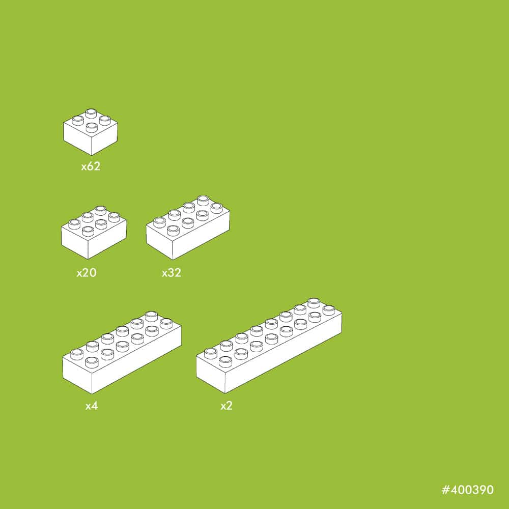 120 piece (62 2×2 building blocks, 20 2×3 building blocks, 32 2×4 building blocks, 4 2×6 Building blocks and 2 2×8 building blocks)