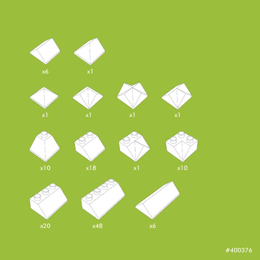 - 124 pieces (86 roof bricks, 14 ridge bricks, 10 inside corner, 10 outside corner and 4 special bricks)