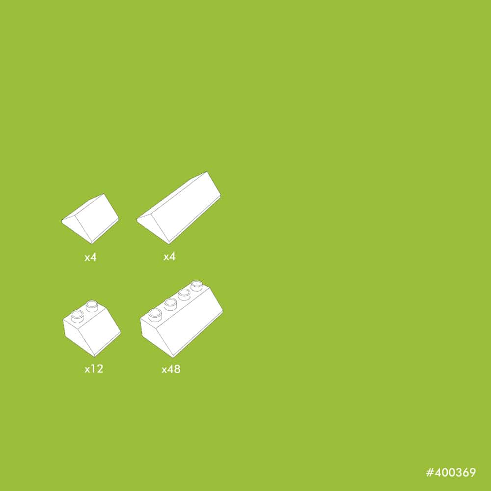 - 68 pieces (48 2×4 roof bricks, 12 2×2 roof bricks, 4 2×4 ridge bricks and 4 2×2 ridge bricks)