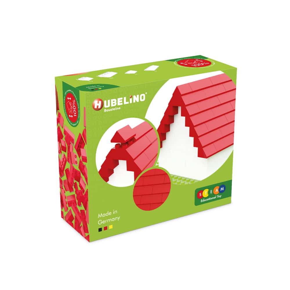 With the 68-Piece Roofing Tile Set set from Hubelino, even the little master builders can finally celebrate the topping-out ceremony and use red roof bricks to give their constructions a nice house. The set includes four different roofing tile shapes, including eight roof ridge stones. The roofing tiles are manufactured exclusively in Germany and are 100% compatible with popular building block systems from other manufacturers for children from 1.5 years of age.