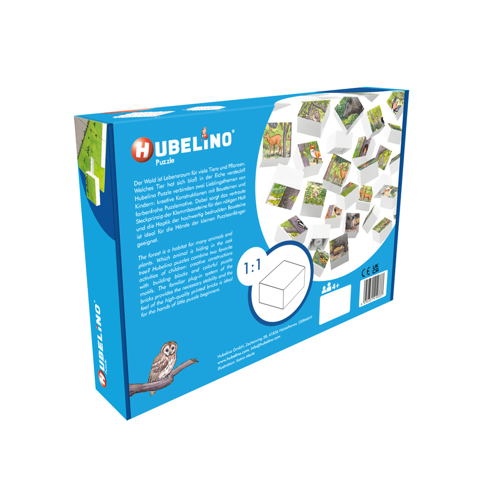 The forest is a habitat for many animals and plants. Which animal is hiding in the oak tree? Hubelino puzzles combine two favorite activities of children: creative constructions with building blocks and colorful puzzle motifs. The familiar plug-in system of the bricks provides the necessary stability and the feel of the high-quality printed bricks is ideal for the hands of little puzzle beginners.