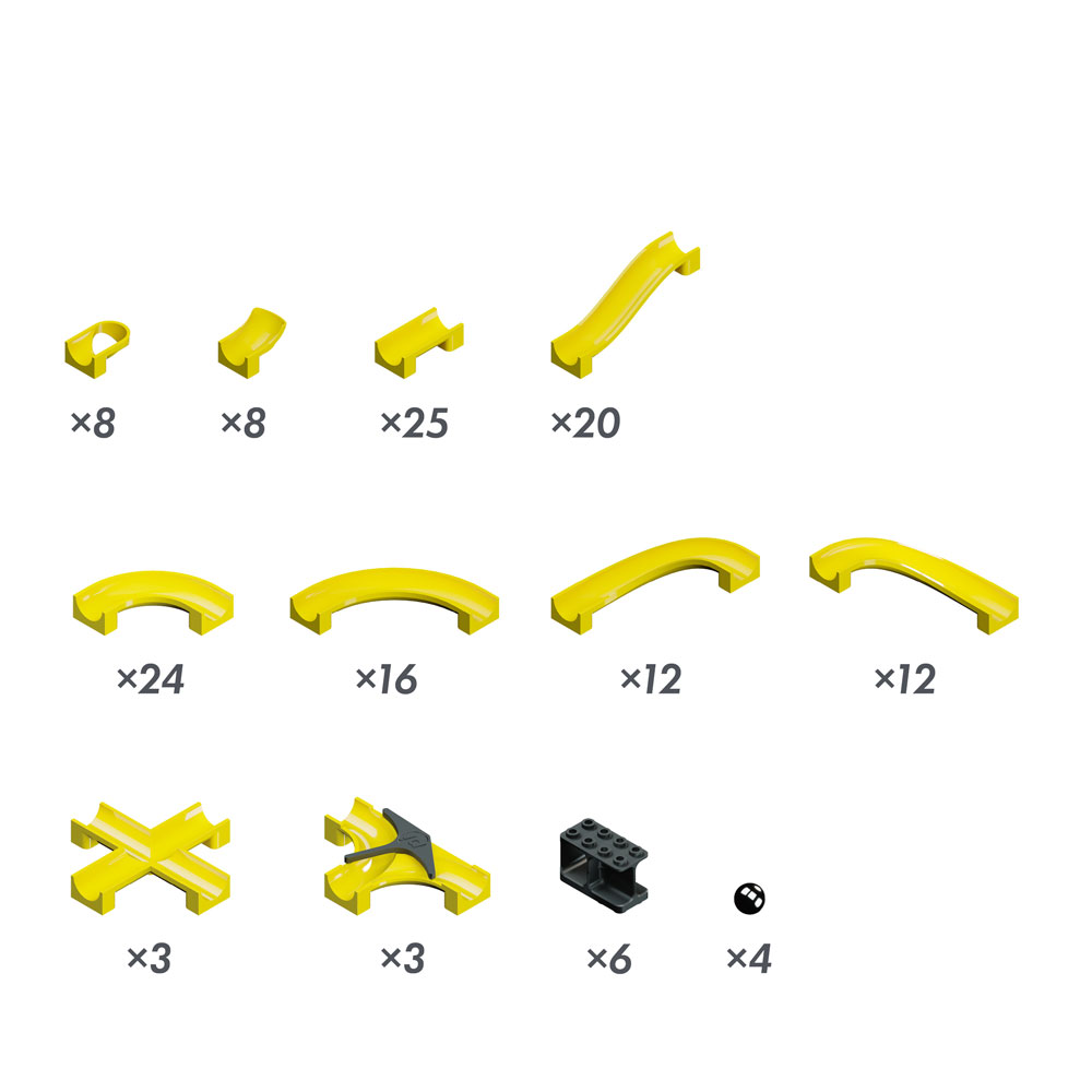 - 141 pieces (137 run elements and 4 marbles) + Instruction book