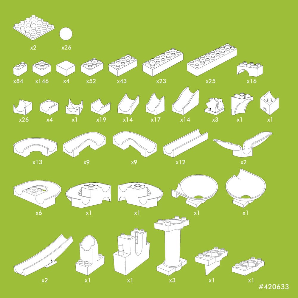 - 585 pieces (162 run elements, 377 building blocks, 18 special elements, 2 baseplates, 26 marbles) + Instruction book