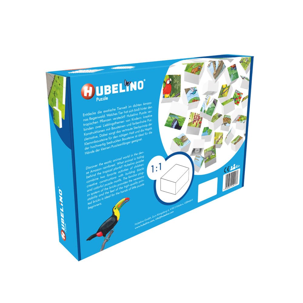 Discover the exotic animal world in the dense Amazon rainforest. What animal is hiding behind the tropical plants? Hubelino puzzles combine two favorite activities of children: creative constructions with building blocks and colorful puzzle motifs. The familiar plug-in system of the bricks provides the necessary stability and the feel of the high-quality printed bricks is ideal for the hands of little puzzle beginners.